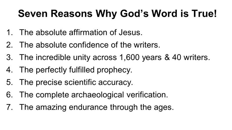 There's seven reasons why I believe the Bible is true. Number one, Jesus believed it. That settles it. By the way, did you know that? Jesus held a Bible, the Old Testament that you have right now, exactly matches word for word what Jesus had. Exactly. We know the Bible data. Jesus taught from the Septuagint. The Septuagint was a translation of the Hebrew Old Testament into Greek. We still have copies. Jesus used that. You have a Bible that Jesus affirmed every word in it, every chapter, every book, every story, every doctrine, every person. Jesus called it scripture.