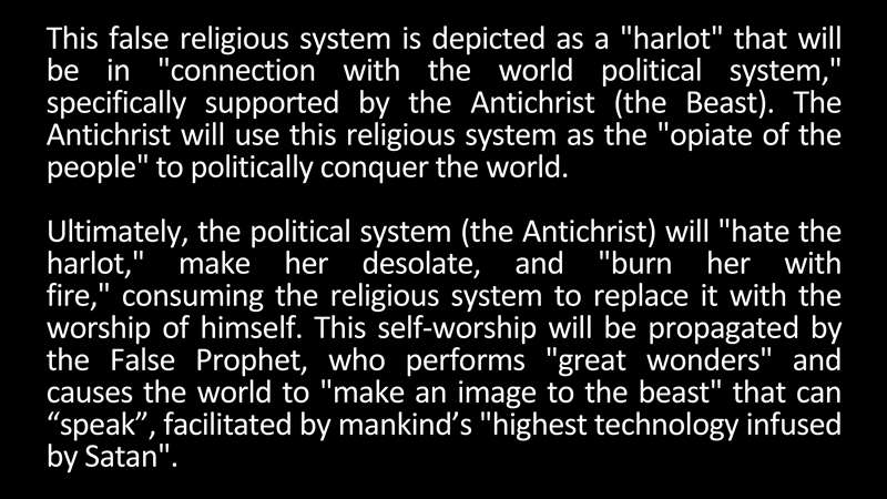 Ultimately the political system, which is the antichrist will hate religion maker desolate. This is what Revelation 17 tells us and then leads into chapter 18 with the commercial part and consuming the religious system, replace it with worship of himself. This self-worship is propagated by the false prophet we already talked about who performs those great wonders, causes the world to make an image of the Beast that can speak using that technology infused by Satan.