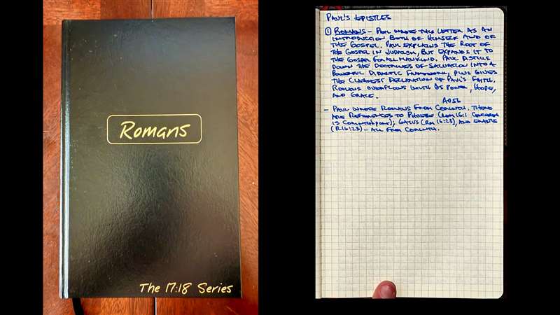 Now, the book of Romans was God's security plan when Phoebe delivered it to the saints in Rome and it started being copied and distributed and it came to us today. Okay? And I'm handwriting to see the difficulty that copying the Scripture is. I'm handwriting my own copy of Romans and it's a thrill. I work on it every morning. I sit down and I open my copy of God's Word and I copy out word by word, and you can look up online the 17:18 series. You'll see them. This costs me about $4.50. And so, what an investment to get me into the Word of God.