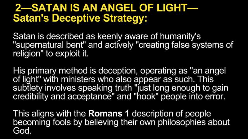 Now, what I think is interesting is, Paul also tells us in 1 Corinthians 12 that Satan is an angel of light and he has a deceptive strategy. Satan is described as keenly aware of humanity's desire and activity to create false religious systems. So, he deceives people as the angel of light and he gives them just long enough to gain credibility, these false teachers, and hook people into error. And that's exactly what Romans 1, and you know also what 2 Peter as we study that book, and Jude say, that people become fools by believing their own philosophies about God. So, Romans 1 is where we're going to see that.