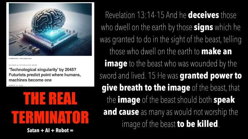 I call that, this, again, is from the Revelation class, I call this the real Terminator. This is called technological singularity. Now, this article, it was, this is really old. You can't see that. It's 2023. It's two years old. It's not 2045 anymore. It's about 2030 at the latest. In fact, it's coming exponentially faster. But look. He deceives, he has signs, makes an image, he's granted power by God to give breath to the image. God allows this. The image can speak and cause as many as would not worship the image of the Beast to be killed. That's what a terminator is. And what we see is the fusing of the human brain to computers. And soon what is called AGI, artificial general intelligence, which is where human reasoning is possible is coming.