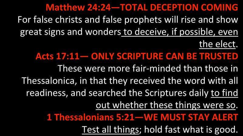 Matthew 24:24 says total deception is coming. All this error and deception is going to be accompanied by great signs to deceive, if possible, even the elect. And now the way that's written, it's that the elect are not deceivable, but if it were possible to deceive the elect, the deceptions are going to be so overwhelming and believable and powerful that the elect would be deceived. But. look at these admonitions to us as believers Acts 17:11, only Scripture can be trusted. Never forget that. And we have to stay alert and test all things.