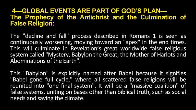 Global events are part of God's plan, the prophecy of the antichrist and the culmination of all false religion. That takes us back to Romans 1. The decline and fall process of Romans 1 is seen in the Scripture as continuously worsening, moving toward an apex in the End Times that will culminate in Revelation's great worldwide false religious system called Mystery Babylon The Great, mother of Harlots, and the Abominations of the Earth. This Babylon is explicitly named after Baal of course, Genesis 11, the tower there because it signifies Babylon full cycle where all the scattered false religions are reunited back into one final system. It's a massive coalition of fault systems uniting on bases rather than biblical truth, such as, look at this, social needs and saving the climate, I think, are going to be two of the big ones.