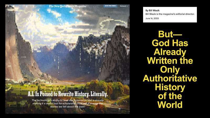 But look at this picture. This slide is from, and you can see it right here, two weeks ago, June 16th, 2025. And it's from The New York Times. You see that? It's the New York Times Magazine from two weeks ago. Look at the headline, "AI is poised to rewrite history - literally". The subheading, "The technology's ability to read and summarize text is already making it useful tool for scholarship. How will it change the stories we tell about the past?" It didn't say stories, it said history. Most people think of history as a science, and they think of the scientific studies of history, but you notice this says, "the stories of history". And basically, it's showing all kinds of computer-generated stuff here, everywhere. And it's like settlers are going into this valley and they are giving the details previously unknown.