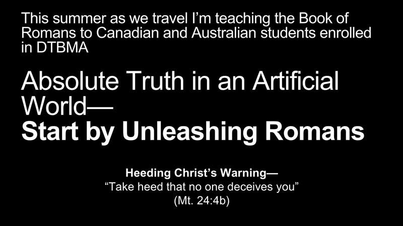 Okay, so this summer as we travel, I'm teaching the book of Romans to Canadian and Australian students who are enrolled in DTBMA. Here's the course: "Absolute Truth in an Artificial World - Starts by Unleashing the Book of Romans". Now you say, why are you teaching Canadians and Australians? That's what I hope you'd ask. Okay, so let me show you.