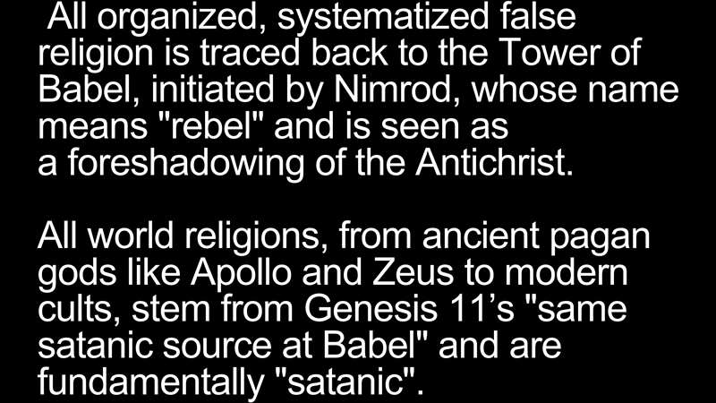 But remember, all organized and systematized false religion traces back to that Tower of Babel initiated by Nimrod, whose name means "rebel". Now you say, wait a minute, where'd you get all this? Well, that's what I'm working into this study in the next weeks for the Canadians and Australians for you as you participate in it. It's based on everything we've already studied in the 52 Greatest Chapters and the Book of Revelation. I'm pulling in elements of these studies to illustrate the book of Romans. If the book of Romans is foundational, then all these other parts will illustrate part of the truth that's contained for us there by the Holy Spirit. So, what we see is all world religions from ancient pagan gods like Apollo. Now, wait a minute. What was Paul sitting under the shadow in Corinth? The Temple to Apollo, the third son of Zeus in Greek mythology, all the way up to modern cults. All of this false religion stems from Genesis 11. The same Satanic source at Babel and all of these religions up through modern cults are satanic. Never forget that. That's what Romans tells us.