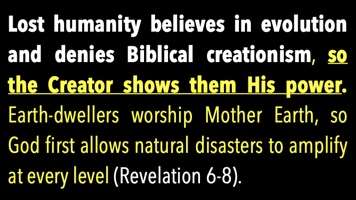 Lost Humanity believes in evolution, denies biblical creationism, so the Creator Himself shows them His power. Earth-dwellers. Earth-dwellers? That's the term God uses for unsaved people. Seven times in Revelation it says, those who dwell on the Earth, those who dwell on the Earth, those who dwell on the Earth seven times. They believe they've got to save this planet. They believe they should revere this planet. They believe their highest calling in life is to protect this planet. God says, okay, if you don't revere the Creator, I'll show you, Earth-dwellers who worship Mother Earth, so God allows natural disasters to amplify. That's what the beginning of the Tribulation is. Global warming, or really getting warm, food scarcity really gets scarce. The weather really gets wild. The sun and the solar cycle go on maximums, like someone turns it up to high. Unbelievable.