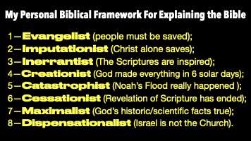 I'm a maximalist. That means that...there are minimalists and maximalists in Christendom. The minimalists say, oh, we're not sure if those scientific facts are true. We're not sure of some of those historical events, like Jonah and the whale, the burning bush, the flood, all that stuff. Maximalists say, we believe it. We believe what God said. And a dispensationalist. Israel is different from the Church. Israel is not the Church.
