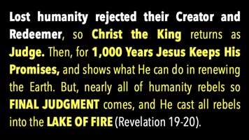 So, lost humanity rejected their Creator and Redeemer, so Christ the King returns. He rules for a thousand years, keeps all of His promises, and renews the Earth. Everyone finally gets to live in a perfect environment, and almost everybody rebels. So, chapter 20 is the final judgment, and he casts all the rebels into the Lake of Fire.