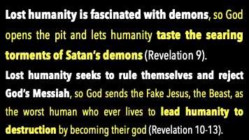 Lost Humanity wants to rule themselves, so God sends the fake Jesus. The beast he's called, you know him as the Antichrist. He has 33 different titles in the Bible. He is the incarnation of Satan, and he's the worst human who ever lives, and he leads humanity to destruction by becoming their God.