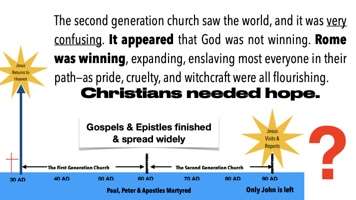Revelation. The 2nd generation Church saw the world, and it was very confusing to them. You just stood up and heard me read that. Think about whether you'd have been in that congregation. This is what your life was like. It appeared God was not winning. Rome was winning. The Roman Empire was expanding rapidly. The Roman Empire was enslaving almost everyone in their path. There were 60 million slaves. Talk about America's past history with slavery. The Roman Empire was really big into slavery. And in the path of the Roman expansion was pride, cruelty, and witchcraft. And at the highest echelons, all that was flourishing, and Christians needed hope.