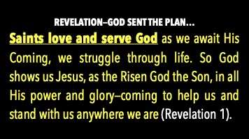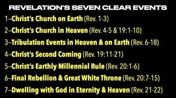 Okay, let me illustrate very quickly in 17 minutes. You know a picture's worth a thousand words. Here we go. This is a book of Revelation in seven, see 1, 2, 3, 4, 5, 6, 7 events, and here they are. Number one, we are the Church on Earth, and Revelation connects all those passages and more that say the Church on Earth ends with Jesus taking us. So, Revelation 1 is saints love and serve God as we await His coming. We struggle through life. That's Paul. You know what Paul called Christians? In Greek, synagonizomai. Two Greek words: syn, meaning with, agonizomai, meaning what it sounds like, agony. He said, Christians are fellow strugglers. We struggle through life, so God shows us Jesus. That's what the revelation is about. He's the risen God, the Son in all His power and glory. He comes to help us and stand with us wherever we are.