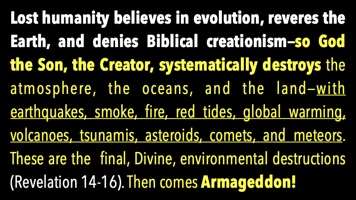 Then Armageddon. Lost humanity believes in evolution, reveres the Earth, denies biblical creationism, so God systematically destroys everything. The atmosphere, the oceans, the land. He sends the biggest earthquake ever. Smoke and fire. Red tides, all the fish in the sea die. Global warming. It burns everyone's skin. Volcanoes, tsunamis, asteroids, comets, meteors. The final divine environmental destruction. Then we have Armageddon.