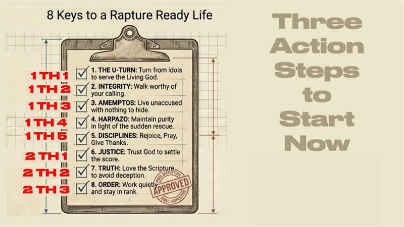 So, the eight keys to a Rapture Ready Life. We're going to study chapter one, chapter two on integrity, blameless before the Lord, the second coming of Christ in the weeks ahead. What a week. That's going to be a glorious week. How to discipline our lives and give thanks and not be like the world letting God His justice come and protect it from the lies of the devil in the world and artificial truth all around us and living that orderly life.