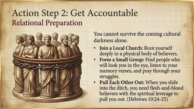 Number two, get accountable. You can't survive the coming cultural darkness without joining a local church and forming a small group. And we need to be doing what it says in Hebrews 10, pulling each other out of the ditch.