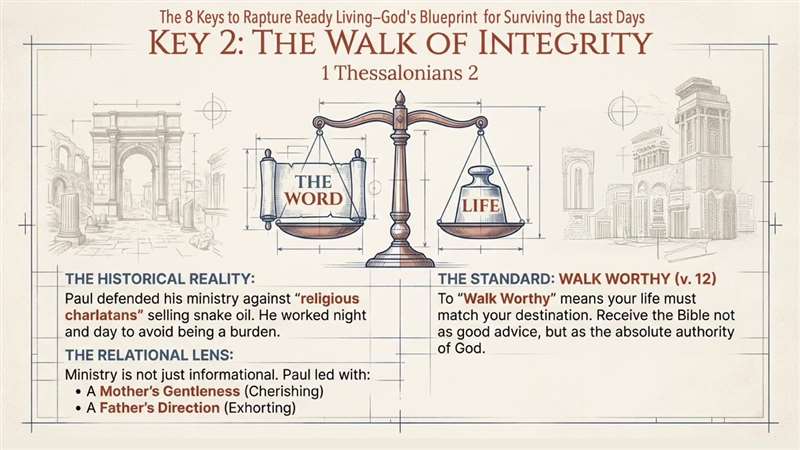 The second key is key number two, the walk of integrity. And basically, that's in verse 12. If you look at chapter two, verse 12, and if you notice I have it all highlighted and marked in my Bible. It says, we exhort each of you and encourage and charge you to walk in a manner worthy of God who calls you into His Kingdom and glory. The second point, the theme of 1 Thessalonians 2 is walk worthy of God. Our life matches our destination where we're headed. And Paul, do you remember the people saw him and I'll teach you about this? He went 97 miles with the beating from Philippi. He went into the bathhouse. Remember public bathrooms, public bath houses of the Roman Empire. And Paul, when he disrobed and went into the bath, everyone was whispering. They're saying, look at all those fresh wounds. He's probably an escape slave, or maybe he's a thief or some criminal. So, look on the left. Paul said, I had a ministry that wasn't just informational teaching. He said, I had a mother's gentleness cherishing you a father's exhortation. And he says, I taught you how you ought to follow Christ.
