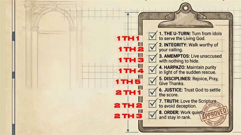 1 Thessalonians 1 is what I call the great U-Turn, how they turn from idols to God, a dramatic transformation in their lives. Chapter two, Paul starts confessing the integrity of life and testimony and ministry that he had. Chapter three, these people whose lives were so deeply enmeshed in the Roman culture and paganism and sin of the day, they came to the theological understanding of justification, and Paul sums up this entire transformation by calling it ememptos, living unaccused, nothing to hide. Chapter four, another Greek word harpazo and that speaks of our blessed hope, the glorious appearing of Christ, and these people-maintained purity in a very impure world, totally parallel to our culture so pornified from advertising to every other part of media. The pornification of culture confronted the purification that Jesus Christ's return offers. So that's going to be a great lesson for us to study. And then chapter five of 1 Thessalonians are the disciplines, rejoicing, praying, giving thanks. In fact, in my Bible, I have marked the incredible 19 different imperatives, and I'm going to be, when we get to that lesson, sharing that with you. Then the sixth lesson is justice, trust God to settle the score. We're not vigilantes, we're not taking the law in our own hands. We trust God. He said vengeance, his mindset, the Lord.