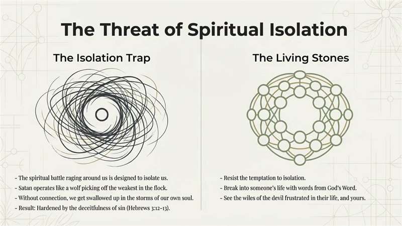 And so many people get caught in that isolation trap and the battles around us, and Satan picks them off the weakest in the flock and they're get getting swallowed up by the storms rather than the strength of living stones connected, resist temptation to isolate, break into someone's life with words from God's Word. You'll see the wiles of the devil frustrated in their life and yours.