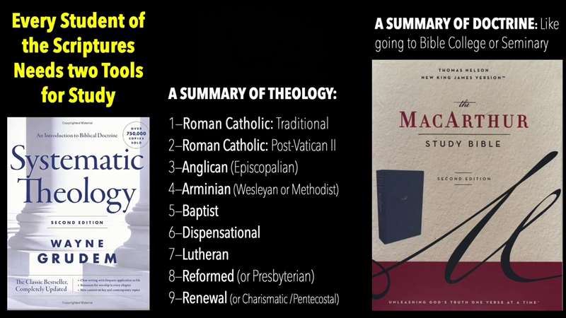 And that is that there are two tools that every student of Scripture needs. On the left, they need a systemic theology, which sums up, you see right down the middle there, a summary of theology throughout all the centuries from the Roman Catholic time, the that Byzantine Church in Jerome and how it grew into the Roman Catholic Church, all the way down through our current modern charismatic Pentecostal renewal period. This theology there is to see systematic theology takes all the verses in the Bible, puts them in the blender, and then pours out around each of the major divisions of systematic theology, all the verses and logically explains them. But it logically explains what the Catholics, the Anglicans, the Armenians, Baptist, Dispensational, Lutheran, reform, Renewable believe. Somewhere in that stream you'll find your background, and none of us are exclusively anything but biblical. Okay?