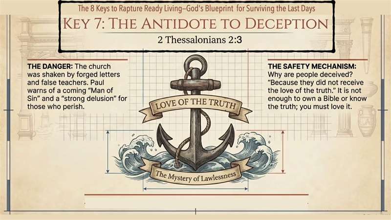 Well, key number seven, 2 Thessalonians 2:3, the antidote to deception, and we're living in the most deceptive times. Look what it says a message to them and for us. Also in verse three, let no one deceive you in any way for that day will not come unless the rebellion comes first. And what Paul gives is even a whole reminder of this. And we're going to go through this in this lesson. When we get to it in seven lessons from now. But the danger is the church was shaken by forged letters and false teachings, and Paul said, this is just the beginning. There's going to be a man of sin. The Anti-christ coming. What's the safety mechanism? Well, we are to love the truth and it's not enough to own a Bible or to know about the truth. We have to love it. And if you're not anchored to the Scripture, we're vulnerable, which leads us to what I'm going to teach you all the way through this class.