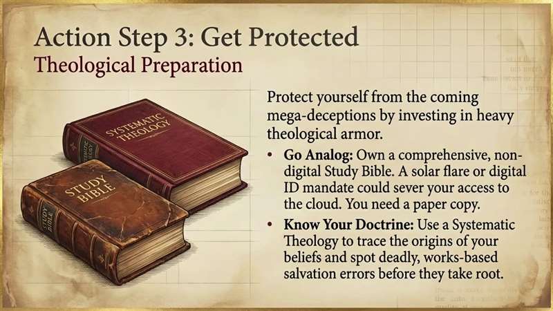 And then finally, get protected. Protect yourself from the coming mega-deceptions by not only having your digital Bible, have an analog Bible and know your doctrine. That's why I talk about the systematic theology in the study Bible.
