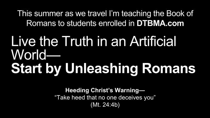 And so, as we travel the goal of our time as we travel is this: this summer we want to teach all of our students enrolled in DTBMA, this course on Romans, and I'm posting this on Facebook for each of you, but it's actually going in as an official course at DTBMA.com. And you ought to, if you want all the slides that, you're going to see me use all the charts, all the maps, all the lists of things. Just go to DTBMA and you enroll with your email address. That's all you have to do. Go there and you register with your email address and look for this course. It's the most recent one. Live the truth in an artificial world. Start by unleashing Romans so that we can heed Christ's warning to not be deceived.