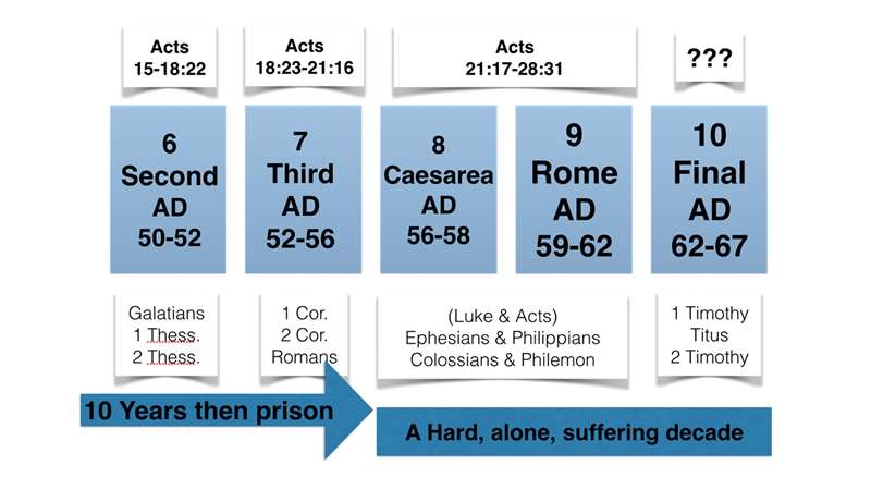 But Paul begins that first imprisonment, Luke and Acts, and then he goes to the second half of it. This is one imprisonment in Rome, and he's there from perhaps 59 to 62, the whole Ephesians, Philippians Colossians. He's released for about five years. He has his final or fourth missionary journey. He writes to Timothy and Titus. Then he's imprisoned. It's a hard, alone, suffering decade. He's shut in. You understand? Shut in, like shut in the prison door. He spends a lot of time chained and in prison.