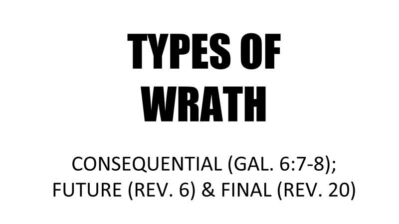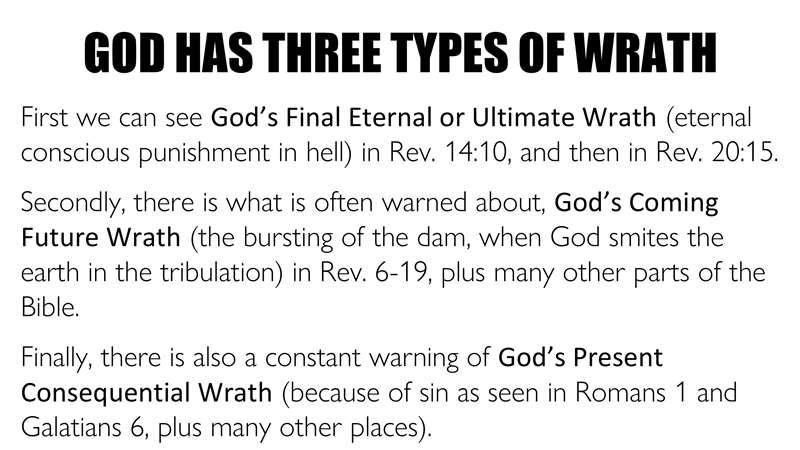 Final, eternal, ultimate wrath, conscious punishment in Hell that's talked about. God's coming future wrath here on Earth. The bursting of the dam during the Tribulation. But God's present, consequential wrath. Romans 1 talks about that. We're going to see that in just a minute at the end of the chapter.