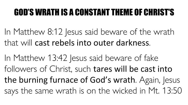 God's wrath is a constant theme in Matthew 8:12. Jesus said beware of the wrath that's going to cast the rebels into outer darkness. And He says it again in chapter 13.