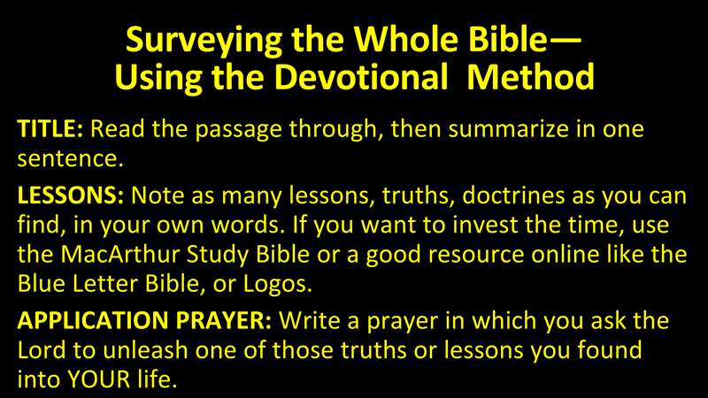 Now, I talked to you about using the devotional method of the whole Bible, and that's what I keep holding and waving around this red notebook. The devotional method is where you write the chapter that you're studying, the summary, the lessons, and then the prayer. You can see that on this slide right here. Read the passage through this week and summarize in one sentence what chapter one is about. Then as you read it through this week, find as many lessons, truths, doctrines. If you want to invest the time, I strongly encourage you to use the MacArthur Study Bible or you can use an online source like Logos, which I use, or the Blue Letter Bible. And here's the most transformational part, write the application prayer in which you ask the Lord to unleash one of those or lessons you found into your life; not the life of your wife or husband, or children or coworkers or family, but your life.
