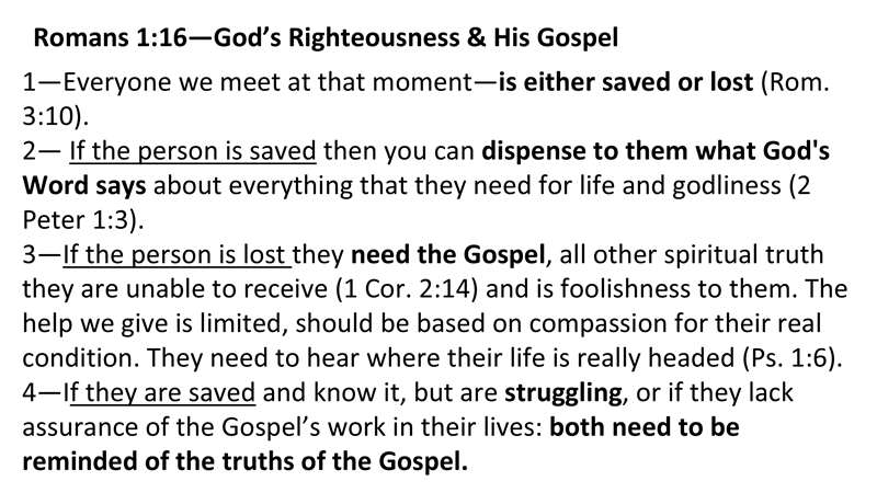 And so, this is what I wrote in my journal: everyone we meet at the moment we meet them is either saved or lost. There's none righteous, no, not one. If the person's saved, then you can dispense to them what God's Word says about everything they need for life and godliness. So, I can help anybody I meet. If the person is lost, then one thing they need - the Gospel. All other spiritual truth they're unable to receive. So, you don't have to argue with them about politics or anything else. They need the Gospel and everything you say is foolishness to them until they're convicted.