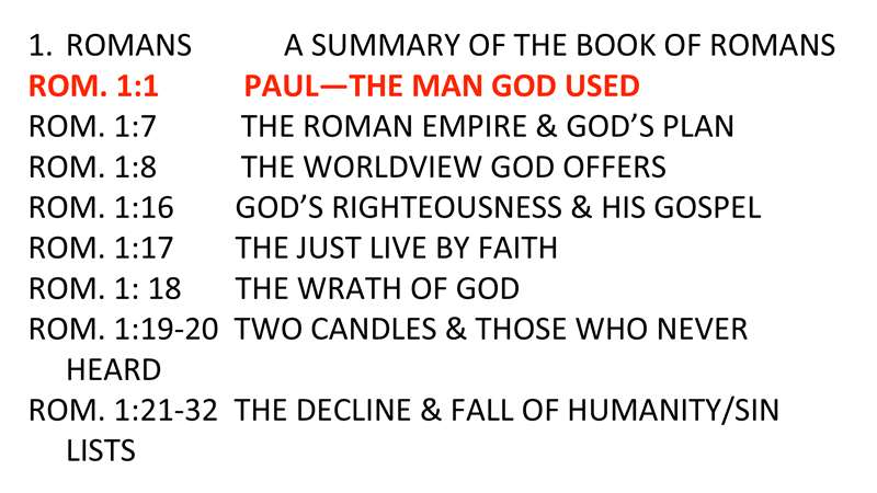 Okay, that takes us to chapter one verse one. So open in your Bible, even if you have to pause, you need a Bible, you need a notebook. You can pause this video at any time. If you're on the DTBMA site there's the study guide, which is an exact transcript plus interleaved all the slides I'm using. They're all right there on DTBMA, and that's part of what we offer to you. But now Romans chapter one verse one, we're looking at Paul, the man God used, and it says, Paul, a bond servant of Jesus Christ, called to be an apostle, separated to the Gospel of God. Paul is the man that God used. He's one of the, maybe the second most written about person in the Bible. Number one is David, and I would assume by the amount of writing space and everything else that goes on with Paul in Acts through Philemon, that he would be the most talked about human in the New Testament. David is the most talked about in the whole Bible. But let's go to the slides and I'll show you what I mean.