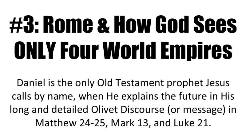 Rome is how God sees the world's history. Daniel, the Old Testament prophet that Jesus calls by name, the only Old Testament prophet Jesus calls by name, and He does that in Matthew 24 when He explains the future in His long detailed Olivette discourse or message in Matthew 24, Mark 13, and Luke 21.