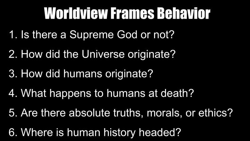 Okay, continuing with the slides. Worldview frames our behavior. Is there supreme God? How did the universe get here? Where do we come from? What happens at death? There are absolutes. Where is human history headed? That's prophecy.