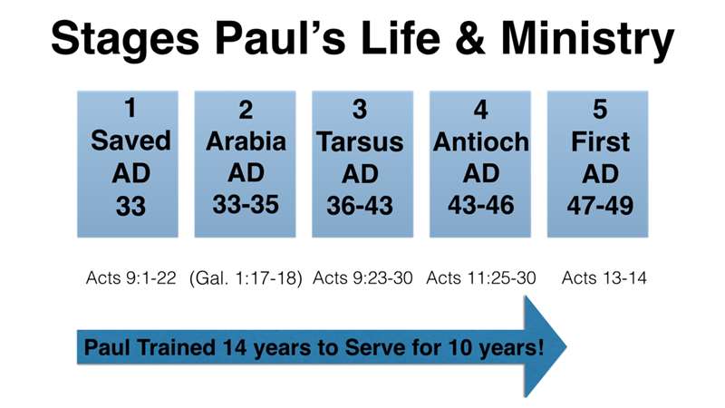 Starting in Acts 9, we learn about Paul's salvation. He was saved about AD 33. Galatians records the next event in his life. He trains for three years in the deserts of Arabia. Then he goes the third stage of his life. He goes home to Tarsus. We find that in Acts 9, Remember right here after 22, it's 23. So right after Bible school, trained by Jesus, he goes home, look at that, for seven years. Now, here's the first principle. Most people don't even know this. Do you realize that Paul trains for longer than he spends in his full-time mission career? I'll show you what I mean. When you look at this from 33 to 43 is 10 years. Then he goes to Antioch for three plus more years, and then he launches here on his first missionary journey. So, Paul trains for 14 years in order to serve full-time for 10 years.
