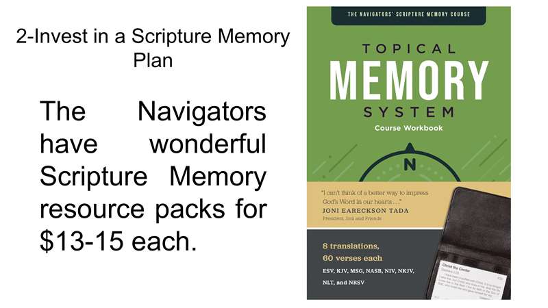 Number two, invest in a Scripture memory plan. This is the cover of the one I use. It's the Navigator Topical Memory System. 60 verses in your favorite translation. I use the New King James and King James. You can use anyone you want. They're all there. I see it on sale, whether it's on Prime Day or whatever, it's $13 to $15 or so. So that's my second challenge for you.