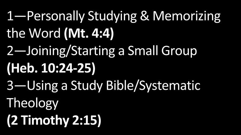 Number one, by personally studying and memorizing the Word. This is a study, and at the end I'm going to talk to you about memory work, joining or starting a small group. And last time yesterday I told you that you should be in a local church, but not as a spectator. Most people are spectators in local churches. Most people sit there. They have their favorite seat. They hardly talk to anyone. They listen to the music and some leave, and some listen to the music and the message. Some only come for the message. I was a pastor for decades and I know the patterns people follow, but they're not connected. You need to get connected.