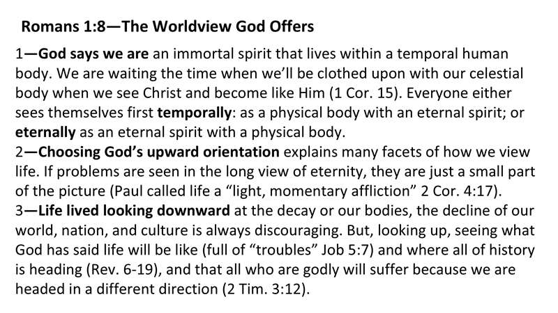 Well, look at this slide, the worldview God offers. First, He told us that we're in immortal spirit inside a temporal human body. So, with that truth. Everyone either sees themself first temporally, that means we're thinking about the physical body and how to feed it and clothe it and enjoy it and be secure. And we know we have an eternal spirit, or we look at life from the eternal perspective, that we have endless life and we have this wearing out body. So, we get to choose God's upward orientation. And that's what they had in verse eight. That's why their faith was so evident. They were looking upwardly. They saw all their problems in the long view of eternity. They're just a small part of the picture.