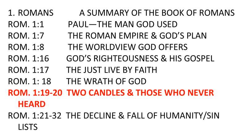Two candles and those who never heard and that's something people always ask about. What about the people who never heard the Gospel? Look at verse 19. It says, because what may be known about God has manifest in them, for God has shown it to them, that's their conscience, for sense of creation of the world the invisible attributes are clearly seen, understood by the things which are made even His eternal power and Godhead, so that they're without excuse. That's creation. So, verse 19 talks about our conscience, that's God's ally that lives inside of everyone saved and lost, and the other candle that we're born with, the first one is conscience. The second one is creation. Either you look inside and say, why do I keep feeling I shouldn't do that? That's your conscience. God put it there. And until you totally trample it down and ruin it by hardening yourself so many times that you can't even hear that still, small voice, you'll have that conscience and that conscience will lead you toward God just as creation will.