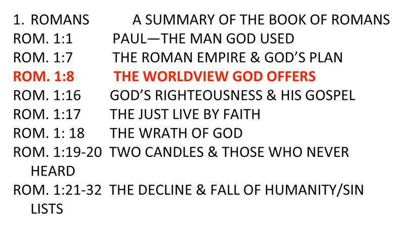 And that is why this book is so important, because this is everything you need to know to survive the runup to the final form of the Roman Empire. Now, God offers, in verse eight, a worldview. So, let's look at that. Let's read verse eight. So, we're still sitting and probably you've gone and refilled your coffee because we're on minute 36 and I need to speed up. First, I thank my God through Jesus Christ for you all, this is Romans 1:8 for you, all that your faith is spoken of throughout the whole world. What is Paul saying? He doesn't talk about how healthy they are. He doesn't talk about how wealthy they are. He doesn't talk about how physically accomplished, how athletic they were, how artsy they were, how latest technology they were, how they were rated, and how many friends they had and their pictures on Instagram. What does he say? See, we've got to see Christianity and what we're studying and why we need to study Romans is God wants us to adopt his worldview instead of Satan's.