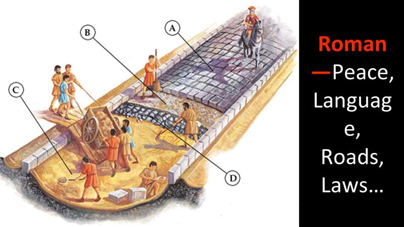 But Rome not only had its famous roads that Bonnie and I have driven on these roads, I mean in different parts of the world. When we were ministering in France, we were on our way to minister in Switzerland and we were driving along and all of a sudden there was a road sign, and it showed us that the road that we were going on from France into Germany, or I mean France into Switzerland, was a Roman road just like this one. And you could still see the blocks and all over we've walked on them, I've taught on them, you see them. But the Roman roads took Roman peace to the edges of the Empire Roman language, the lingua franca, Koine Greek, Roman laws and customs were how the Gospel was exported.