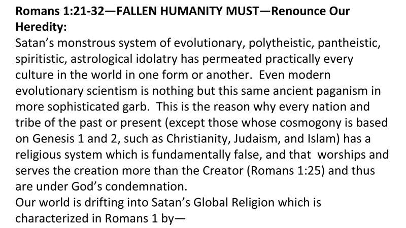 Fallen humanity. We need to renounce our heredity. At Babel, Satan's monstrous system of evolutionary polytheistic, pantheistic, spiritistic, astrological idolatry has permeated every culture in the world in one form or another. Even modern evolutionary scientism is nothing with the same ancient paganism and more sophisticated garb. And that's why every nation or tribe, past or present, except those whose cosmogony is based on Genesis 1-2. And this is what the Answers In Genesis site, you can read all about this, has a religious system that's fundamentally false. It worships and serves creation more than the Creator. That's what 1:25 says.