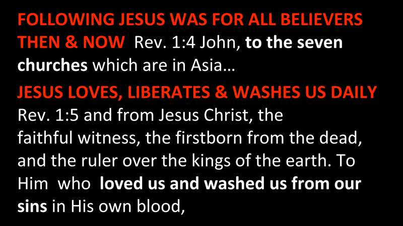 Following Jesus is for all believers. John says to the seven churches, seven? There were probably a hundred. Paul was a busy church planter, and he multiplied all the time. Why seven? Because to the Jewish mind, remember the context? Seven was a complete set, just like there are seven colors in the spectrum, just like there are seven notes in the scale. When you get to that eighth note, you've started over again, and that's reflective of the complete set kind of thing. Verse 5, Jesus loved us and washed us from our sins. Jesus wants us to walk in the boldness that comes of knowing that we're cleansed.