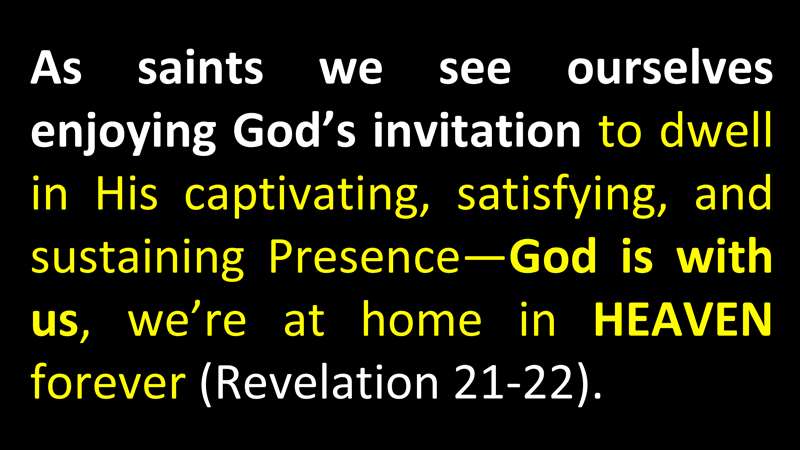 Then the happy ending, here it is: Heaven. We dwell in the house of the Lord forever. I think that's why the Early Church loved Revelation: it had a happy ending. As Saints, we see ourselves enjoying God's invitation. We come to a banquet and we sit down with the Saints of all the ages. God is with us, and we're at home in Heaven forever.