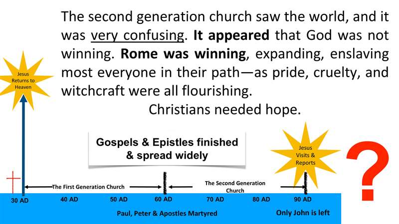 I mean by A.D. 70; the Jewish people are being erased. Christianity is being hunted down. Everybody is facing the almost unstoppable Roman Empire. So, now 80 A.D., 90 A.D. John is left, and Jesus, who ascended to Heaven around A.D. 30, comes back and visits the local churches. That's what Revelation's about. Revelation 2 and 3 are Jesus walking around churches with them, not seeing Him. He's seeing how they operate when they don't know anybody's watching. Okay?