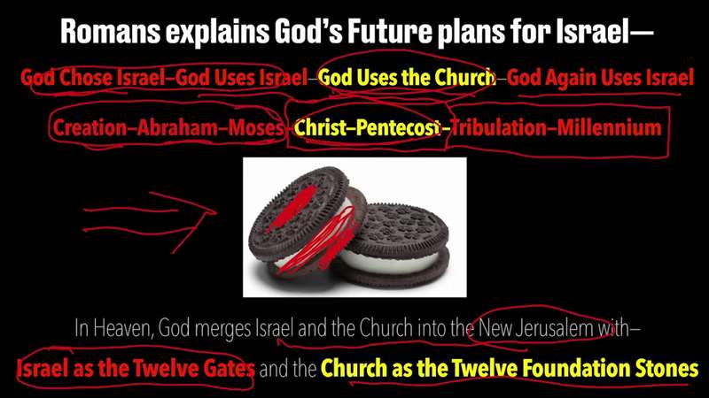 First of all, the book of Romans solves something. Romans explains God's future plans for Israel, and some of you are very prophetic and you want to know what's going on out there with Iran and Russia and China and everything else. Well, let me just summarize the Bible. We'll see this in a second in Romans. The Bible shows that God chose Israel. God uses Israel. Then, we find in the New Testament, God uses the Church, but then by the time we get to the Book of Revelation, God again is using Israel. So basically, we have creation, Abraham, Moses, that's all centered around God's plans for Israel. Then we have the time of Christ and Pentecost and the epistles, and then we have the epistles and Revelation talking about the Tribulation. And if you notice, the yellow is the Church and the red is Israel. Now look at this. This is one of America's bestselling cookies. You recognize it, don't you? You notice the distinctive it, it has these the two cookie covers, top and bottom, and then it has the filling. That's what I think about when I think about what God explains to us about Israel. Because in Heaven, God merges Israel and the Church in the New Jerusalem with Israel as the 12 gates, kind of like the beginning and ending, and the Church as the 12 foundation stones, what pulls it all together. Everything is built on the foundation. So, God has plans for Israel. He chose them. And He's coming back to use them again. And right now, we're that beautiful filling right there. And we're going to see the book of Romans explains that. Okay? But we'll get to that in a second. Okay.